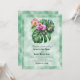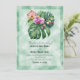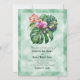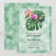 Una invitación a la boda con elegantes flores de orquídea y hojas de monstera sobre un fondo de papel de pergamino verde pálido.