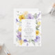 Invite a sus amigos y familiares con estilo y establezca el tono de su día especial con esta encantadora invitación a la ducha de bebé. El diseño presenta flores de color morado y amarillo y vegetación sobre fondo blanco.