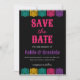 ¡Celebra tu amor con esta elegante y festiva tarjeta de cita! Con un hermoso diseño floral inspirado en el tradicional papel picado mexicano, esta tarjeta es perfecta para una boda de destino o una celebración temática de fiesta. El fondo negro crea un estilo sofisticado y moderno, mientras que los colores vivos y los detalles intrincados le dan un toque de encanto tradicional.