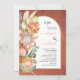 Invitación de boda de flores tropicales protea pasto pampas y hojas de eucalipto arco de terracota. Este encantador diseño de boda cuenta con un marco de arco en fondo manchado de terracota con tus iniciales y texto. A la izquierda hay flores protea, pasto pampas y hojas de eucalipto.