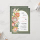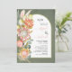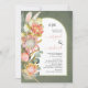 Protea tropical flores pampas pasto y eucalipto deja invitación a la boda verde arco. Este diseño de boda bonito presenta un marco de arco sobre fondo verde manchado con sus iniciales y texto. A la izquierda hay flores de protea, pampas y hojas de eucalipto.