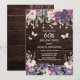 Invitación a la fiesta de cumpleaños número 60 para mujeres con un fondo rústico de madera de grano marrón oscuro y luces de cuerda relucientes y decoradas con flores y mariposas color rosa, lila y morado. Comuníquese conmigo para obtener ayuda con sus personalizaciones o para solicitar productos adicionales de correspondencias o coordinación de Zazzle para su fiesta.