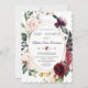 Diseño moderno y elegante con corona de flores en acuarela de color borgoña, ciruela y rubor alrededor de un marco dorado falso, divisor floral; en la parte posterior, ramo floral sobre fondo borgoña; en la parte posterior, un ramo floral sobre fondo azul marino. Se pueden encontrar artículos coincidentes en mi Colección de Baby Shower de Flores Acuarela.
