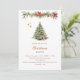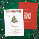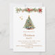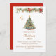 Invitación de invierno para un fiesta de Navidades. Un fondo blanco en la parte delantera, decorado con un pino pintado a mano en color agua con adornos rojos y dorados. Algunas estrellas y un Navidad decoraron la guirnalda con conos y flores rojas de Poinsettia. Personalice y agregue los detalles de su fiesta. Texto dorado. Fondo rojo. Agregue la dirección URL de su sitio web al código QR para los detalles de RSVP y/o fiesta.