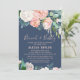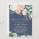 Esta romántica pionia florida brunch azul y tarjeta de invitación burbujeante es perfecta para una elegante ducha nupcial. El diseño floral está decorado con flores de color rosa, melocotón y acuarela blanca en cascada sobre un fondo azul marino.