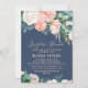 Esta romántica tarjeta de invitación a la ducha de lencería azul es perfecta para una elegante ducha de novia. El diseño floral está decorado con flores de color rosa, melocotón y acuarela blanca en cascada sobre un fondo azul marino.