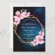 Una invitación floral tropical de 50 años (o de cualquier edad) con flores de hibisco rosa, vegetación y un marco geométrico de oro falso. Un cielo azul oscuro como fondo. Plantillas para un nombre escrito con un script de estilo moderno con letras a mano, plantillas para la información del fiesta. Texto blanco. ¡Ideal para celebrar el verano, la piscina o la playa! Atrás: cielo azul como fondo.