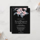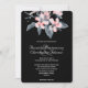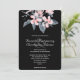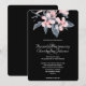 Una invitación de boda con una bonita ilustración de acuarela de flores rosadas con hojas grises en un solo tallo. Un diseño botánico elegante y moderno. Fondo negro.