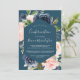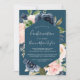 Esta invitación de confirmación de color azul celeste y azul marino es perfecta para un evento floral. El diseño es clásico y elegante, con un fondo azul verde azulado, y está decorado con un acuarela de color azul marino moderno y flores rosas rubias.