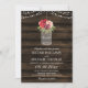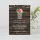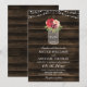 Invitación a una boda rústica con un frasco de albañiles con flores de color burdeos y marsala, colgando de las luces de cuerda sobre un fondo de madera oscura de granero.