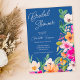 Elegante, luminoso y audaz ilustracion de verano moderno primavera con flores silvestres de gran tamaño y guión de broche ducha de novia con una moderna tipografía de caligrafía con flores de neón rosa brillante, naranja, verde y amarillo sobre fondo azul.
