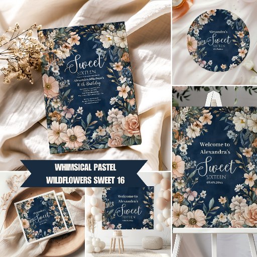 Navy Blue Pastel Wildflowers Sweet 16Diseñado por Andreea Eremia