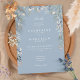 Una elegante invitación de boda con flores silvestres de acuarela que enmarca los detalles de su celebración de boda en tipografía blanca elegante sobre un elegante fondo azul polvoriento. Diseñado por Thisisnotme