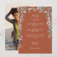 Hermosa vegetación floral de flores silvestres enmarca los detalles de su celebración de boda especial en elegante tipografía sobre fondo de terracota con su foto de boda especial en el reverso. Diseñado por Thisisnotme© Diseñado por Thisisnotme©