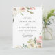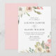 Elegantes invitaciones florales a bodas con detalles bodas, acompañados de ramos de rosas acuáticos y hojas en tonos suaves de rosa, marfil, malva y verde en las esquinas superior e inferior. El lado inverso muestra un fondo rosa claro sólido. Diseñado para coordinar con nuestra colección de bodas de Flores sutiles.