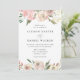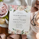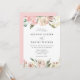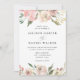 Elegantes invitaciones florales a bodas con detalles bodas, emparejados con los bordes superior e inferior de los rosas acuarelas y hojas en tonos suaves de rosa, marfil, malva y verde. El lado inverso muestra un fondo rosa claro sólido. Diseñado para coordinar con nuestra colección de bodas de Flores sutiles.