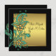 Flores verde azuladas azules y doradas elegante invitación Bat Mitzvah negro y dorado.