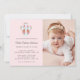Invitación Flores y cruz en bautismo fotográfico rosa pálido