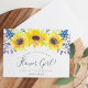 La carta de presentación de la fiesta de novias floral rústica incluye un borde superior de girasoles color amarillo y capullos de flores silvestres azul marino. Personalice con sus detalles de solicitud de chica de flores (mostrada con "¿será mi chica de flores? No puedo decir que lo haga sin ti") en escritura con letras a mano moderna y letras serif tradicionales. Las invitaciones se invitan al azul del puerto rico.