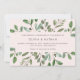 En esta moderna invitación a la boda se respira un marco con abundantes hojas de color verde acuático y algunas pequeñas bayas sobre un suave fondo rosa. La parte trasera de la invitación también dice "Boda" en caligrafía elegante.