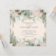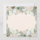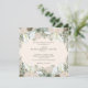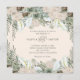 Estas invitaciones a bodas floridas de acuarela tienen muchas hojas verdes con flores en tonos suaves de verde, crema, salvia y marrón sobre un fondo suave y ruidoso.