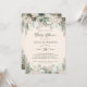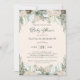 Estas invitaciones a la ducha floral con acuarela cuentan con abundantes hojas verdes con flores en tonos suaves de verde, crema, salvia y marrón sobre un suave fondo de color negro.