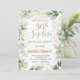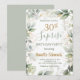 Elegante invitación de fiesta de cumpleaños número 30 bordeada de hojas verdes y doradas al estilo acuarela.