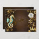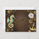Fondo de madera marrón con mar, cresta mecánica, volante antiguo, ancla dorada y varios engranajes de oro y latón. Estilo Steampunk.