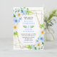 This fun and whimsical wedding invitation features watercolor blue forget me nots, daisies and foliage on a gold geometric frame. The text combines handwritten script and serif fonts for a stylish and modern look. This is perfect for a spring or summer rustic wedding.