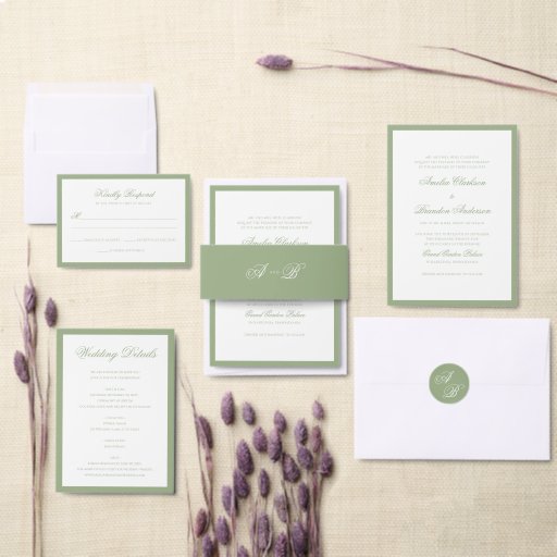 Invitación Formal Sage Green & White Border Script Wedding