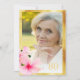 Una carta femenina y elegante de invitación a la fiesta de cumpleaños número 80. Flores de hibisco rosa suave sobre un elegante fondo blanco, y un marco dorado falso. Delante: Plantillas para una foto y su edad Atrás: Plantillas para la información de su fiesta.