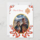 Esta elegante invitación a la boda incluye una foto redonda rodeada de ramas de flores rojas de cerezo y un nudo dorado e interminable sobre un fondo blanco. Nombres de novias y novios en un elegante guión clásico.