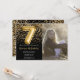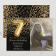 Foto Elegante invitación de fiesta de cumpleaños en negro y oro para un chica de 7 años con elegante escritura de escritura de diseño de fuentes de oro y divertidos globos de Relieve metalizado.