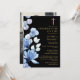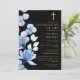 Esta invitación elegante negra y dorada con flores azules para la celebración cristiana de la vida y el recuerdo se puede personalizar con su información en tipografía clásica y una foto de su ser querido en el reverso. Diseñado por Thisisnotme©