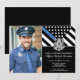 Honren la dedicación y el duro trabajo de un nuevo agente de la policía con esta invitación a graduarse de la policía personalizable. Con una insignia de la policía y una bandera de la fuerza policial con audaces rayas blancas y negras y una orgullosa delgada línea azul, este diseño simboliza fuerza, servicio y sacrificio. La invitación se personaliza con el nombre del graduado y los detalles de su fiesta, lo que lo convierte en un recuerdo memorable para amigos, familiares y colegas. Perfecto para celebrar la graduación, promoción o hito de una academia de policía en la carrera de un futuro oficial. Invite a sus invitados con estilo y muestre su apoyo al miembro más nuevo de la comunidad de la delgada línea azul. Personalizar aún más lejos con una foto del oficial graduado de policía.