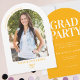 Dejen que su familia y amigos participen en la celebración de la graduación con esta invitación a la fiesta de graduación de color amarillo dorado con fotos de arte moderno. Sencillo pero sofisticado con un texto amarillo vibrante en la parte frontal y una parte posterior sólida con texto blanco hace que esta invitación sea ligera, ventilada y divertida. La foto del graduado en la parte delantera, en forma de arco moderno, con un elegante texto curvo, atrae a la familia y a los amigos: "Celebremos al graduado", mientras que la parte trasera tiene detalles del fiesta. El tipo retro brillante se acentúa con caligrafía moderna para la tipografía 'Clase de' por interés visual con un toque moderno.