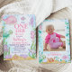 Foto de ballena rosada Oneder the Sea 1st Birthday Invitation Cute uno-der la invitación al primer cumpleaños con temática marina presentando varias criaturas del mar como una ballena rosa, tortuga marina verde, medusas y más. Ideal para una invitación de primer cumpleaños con temática marina y cuenta con una foto en la parte trasera.
