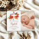 Elegante madera marrón y naranja roja otoño con flores y hojas de otoño con bautizo de cruz cristiana blanca. Agrega tu foto de bebé.