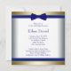 Invitación de bautizo azul real y dorado con corbata de lazo azul real bonita en un fondo dorado bonito. Agregue su foto y detalles del evento en el estilo de fuente y redacción que prefiera.