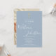Una elegante invitación de bautizo con una firma de nombre con letra chic. Personalice con la información especial de su bautizo en letra chic sobre un fondo azul polvoriento y una foto especial en el reverso. Diseñado por Thisisnotme©