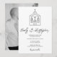 Diseño encantador de “ir a la capilla” con una capilla de boda dibujada a mano en blanco y negro. Ideal para conjuntos nupciales románticos y minimalistas, papelería de boda y celebraciones inspiradas en coquette.