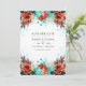 Tarjeta de aviso de boda con rosas acuarela turquesa y coral y follaje iridiscente diseñada para ser personalizada rápida y fácilmente según los detalles de su evento.