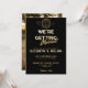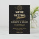 Esta moderna invitación de boda disco retro negro y dorado puede ser personalizada con su información en tipografía moderna y una foto especial al revés. Diseñado por Thisisnotme©