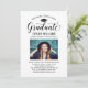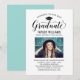 Celebre a su graduado con esta elegante invitación a la fiesta de graduación que presenta un guion de caligrafía "Graduado" floreado acentuado por un icono de gorra de graduado, un retrato de último año y todos los detalles de la fiesta en un diseño limpio y blanco. El diseño simple impulsado por la tipografía deja que la hermosa letra y su foto tomen el centro de la escena con una tarjeta azul turquesa coordinada en la parte posterior. Texto totalmente personalizable en todo momento.
