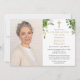Una elegante invitación de recuerdo de funeral de celebración de vida cristiana con vegetación botánica y tipografía clásica. Diseñada por Thisisnotme©