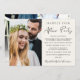Anuncio de elopement de crema elegante y sofisticado / invitación a la recepción de boda pequeña. La parte delantera presenta su foto y "Fiesta Felices para siempre" en una mezcla de tipografía simple y una escritura moderna. Personalice su anuncio e invitación, y agregue sus nombres en una escritura similar a una firma. En la parte posterior, agregue otra foto, sus nombres y la fecha de la boda o evento.