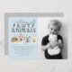 Invitación a una fiesta para el cumpleaños de su hijo, con ilustracion de acuarela de perros - dalmatiano, beagle, pit bull terrier. Todos llevan gorras fiestas. El texto de arriba dice "llamar a todos los animales indefensos" y la información del fiesta está debajo de los perros. También puede agregar una foto de su hijo junto a ella.