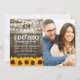 Invitaciones de fiesta de compromiso de pareja rústicas "Me caso en BBQ" con fondo de barril de madera de granero, foto de la futura novia y novio, luces de hadas, girasoles amarillos dorados, anillo de compromiso de boda, tu monograma y una plantilla de celebración de ducha de pareja fácil de personalizar.