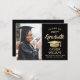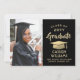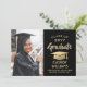 Anunciar una graduación de secundaria o universitaria e invitar a la familia y amigos a celebrar con invitaciones de personalizado de fiesta en negro y oro. La imagen y la redacción son fáciles de personalizar y los colores son fáciles de cambiar con la herramienta de diseño de Zazzle. Esta plantilla descargable se configura como una tarjeta de invitación combinada y una invitación de fiesta que se puede personalizar con cualquier detalle de su elección, como los nombres de los padres, honores especiales, título de grado, presupuesto inspirador favorito, planes futuros de graduados o nueva dirección. El diseño presenta un falso gorro de tablero de mortero de Relieve metalizado, caligrafía moderna y elegante, tipografía vintage clásica y una foto favorita, como una foto senior o una imagen de la ceremonia de inicio. Tenga en cuenta que el oro es color impreso, no Relieve metalizado metálico. Esta tarjeta de graduación imprimible es una manera elegante de anunciar una celebración especial del día. ¡Felicitaciones al graduado!