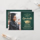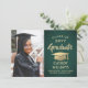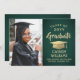Anunciar una graduación de secundaria o universitaria e invitar a familiares y amigos a celebrar con invitaciones de personalizado de fiesta verde y oro. La imagen y la redacción son fáciles de personalizar y los colores son fáciles de cambiar con la herramienta de diseño de Zazzle. Esta plantilla descargable se configura como una tarjeta de invitación combinada y una invitación de fiesta que se puede personalizar con cualquier detalle de su elección, como los nombres de los padres, honores especiales, título de grado, presupuesto inspirador favorito, planes futuros de graduados o nueva dirección. El diseño presenta un fondo oscuro y verde oscuro, una tapa falsa de la placa de mortero de Relieve metalizado, una caligrafía moderna y elegante, una tipografía vintage clásica y una foto favorita, como una foto senior o una imagen de la ceremonia de inicio. Tenga en cuenta que el oro es color impreso, no Relieve metalizado metálico. Esta tarjeta de graduación imprimible es una manera elegante de anunciar una celebración especial del día. ¡Felicitaciones al graduado!